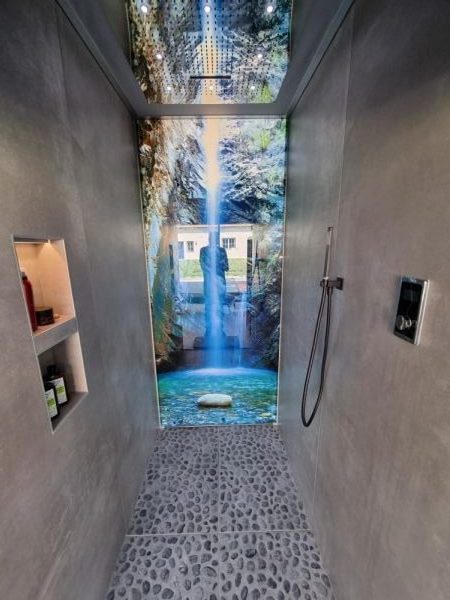 Direkt vom „Wohnbereich“ mit integrierter Saunabar geht es in die Sauna und rechts in das großzügige Soleum (Dampfbad mit Soleinhalation) und in die begehbare Wellnessdusche.