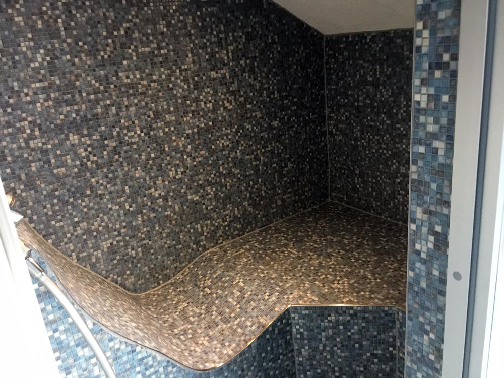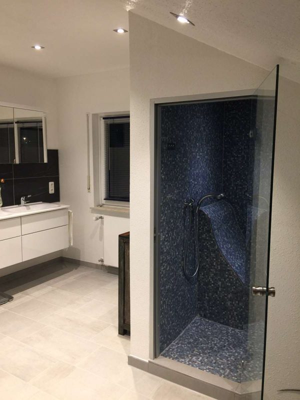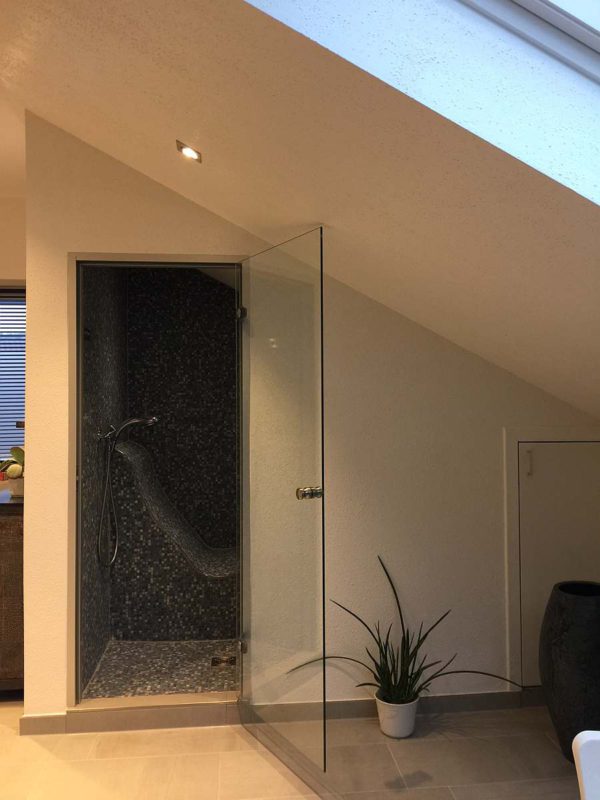 Hier sehen Sie ein schönes Projekt in Deutschland. Der Platz unter der Dachschräge wurde für dieses schöne Dampfbad optimal genutzt. Zum Duschen bleibt im vorderen höheren Bereich viel Platz und im hinteren Bereich ist noch eine Sitzbank verbaut. Die Technik wurde im hinteren nach untern verlaufenden Wandteil eingebaut und somit ist auch der schlecht zugängliche Teil optimal genutzt. Zur Dampfbadtechnik muss man nur wenn der Dampfzylinder des Dampfgenerators zu tauschen ist.